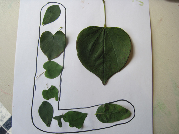 For the next craft, we pulled out the glue again. This time we printed out the letter L and glued Leaves that we collected from the yard all over the L. We also made the Leaf necklace that we featured yesterday but my son has already misplaced it so I was unable to get a picture.